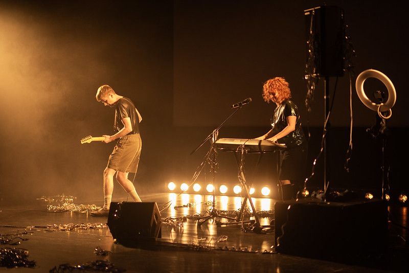 Beim Eintritt in den Theatersaal erwartet uns lauter Punk-Rock, pure Revolte. Ich suche mir einen Platz im hintersten Eck, da ein Aufsteller an der Theaterkasse gewarnt hatte, dass man zum Mitmachen aufgefordert werde. Unsere beiden Lehrenden sind auch Musiker:innen mit Gesang, Gitarre und Syntheziser. Plötzlich brechen sie ihr Spiel ab. Kehraus. Party zu Ende. Calum Perrin fegt Lametta von der Bühne.
