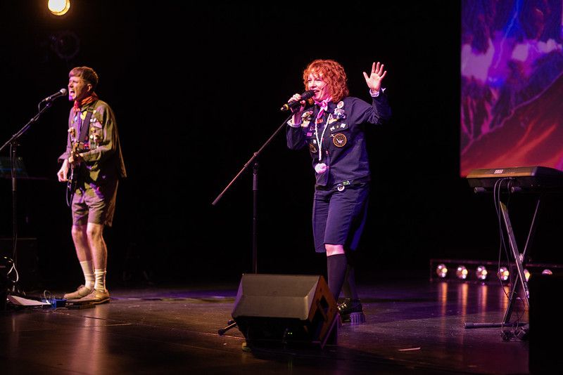 Nun befinden wir uns in einer Zeit nach der AfD-Machtergreifung. Statt glitzernder Bühnenkluft tragen die beiden Performer:innen nun Pfadfinderuniformen, und die „Lectures“ beginnen. Das sind keine Vorträge, sondern Lektionen. Die erste: Ängstlichkeit zu akzeptieren. Zunächst werden per Video so eine Art verbesserte Rorschach-Tests eingespielt, um den Grad der Ängstlichkeit im Publikum zu messen: Unseren Antworten nach, was das Dargestellte sei, sind wir alle noch relativ entspannt. Dann erfahren wir, dass unsere Versuche, uns zu beruhigen, müßig sind, denn wir haben durchaus Grund zur Angst.