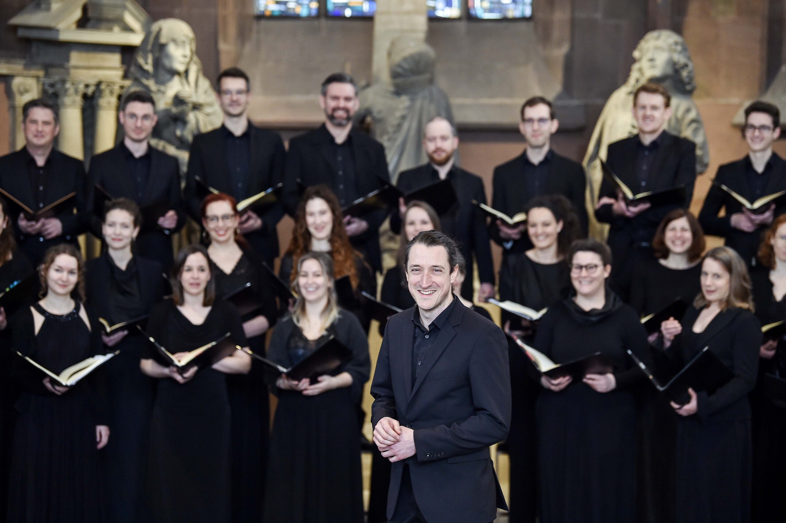 Der vierzigjährige Dirigent, Kirchenmusiker, Orgelimprovisator und Komponist Lukas Grimm ging programmatisch und musikalisch gleich in die Vollen. Er mache „kein Programm, das keine Aussage hat“, sagte er im einführenden Gespräch, sondern wolle „den Chor in der Kulturgesellschaft positionieren“.